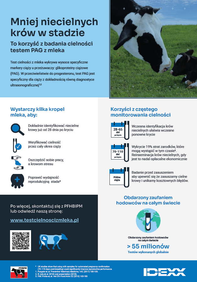 Począwszy od 2019 roku laboratoria PFHBiPM wykonują badania cielności testem PAG w ramach oceny wartości użytkowej. Do badań można wykorzystać próbkę mleka pobraną na potrzyby analizy składu mleka, jak również próbki mleka pobrane przez hodowców tylko do badani ana ciążę, pomiędzy próbnymi udojami.