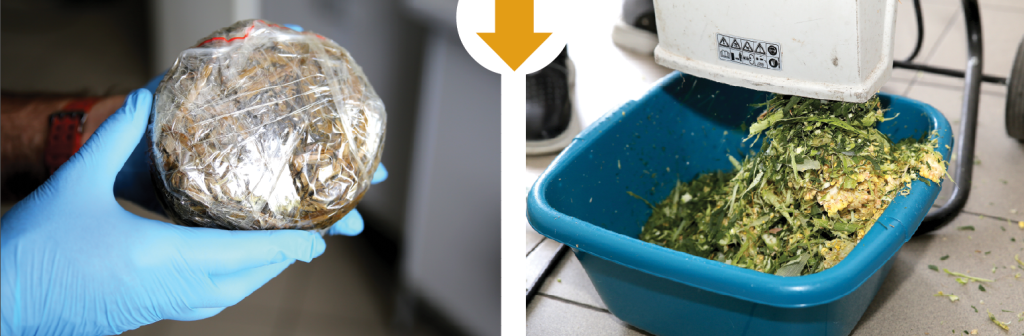Jeśli nie ma żadnych przeciwwskazań, pasza jest wysypywana i w razie konieczności rozdrabniana (dotyczy to kiszonek z traw i/lub lucerny). W tym momencie należy wspomnieć, że laboratoria paszowe PFHBiPM oznaczają też zawartość suchej masy świeżej kukurydzy (całej rośliny) i w tym przypadku nie ma mowy o przeprowadzeniu analizy bez wcześniejszego rozdrobnienia.