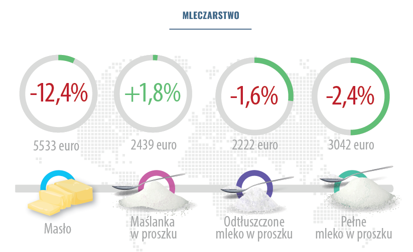 Podczas ostatniej aukcji 2 grudnia 2025 r. ceny pięciu oferowanych kategorii produktów mleczarskich odnotowały spadki. Największe dotyczyły masła – o 12,4% do poziomu 5169 USD/t, bezwodnego tłuszczu mlecznego – o 9,8% do poziomu 5902 USD/t oraz pełnego mleka w proszku – o 2,4% do poziomu 3364 USD/t. Wzrost odnotowały ceny trzech produktów: sera cheddar – o 7,2% do poziomu 4639 USD/t, laktozy – o 4,2% do poziomu 1250 USD/t oraz maślanki w proszku – o 1,8% do poziomu 2903 USD/t.