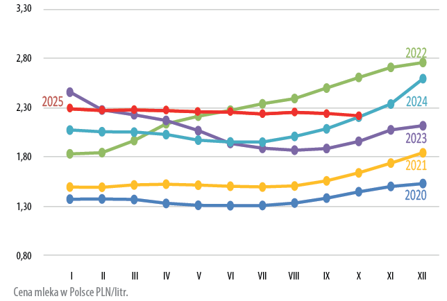 Z najnowszych danych Komisji Europejskiej (opublikowanych 8 grudnia 2025 r.) wynika, że średnia cena mleka w październiku 2025 r. osiągnęła poziom 52,68 euro/100 kg, co oznacza spadek o 1,3% w porównaniu do września 2025 r. (53,41 euro/100 kg). Nadal jednak pozostawała wyższa w relacji rocznej o 1,9%. Zgodnie z szacunkowymi prognozami KE w listopadzie 2025 r. odnotowana zostanie kolejna korekta, a ceny spadną poniżej 52 euro.