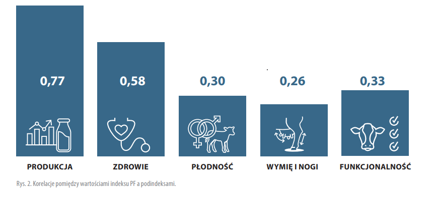 Dla hodowcy opierającego się w swojej pracy hodowlanej na danym indeksie kluczowe jest to, w jaki sposób jego formuła przekłada się na doskonalenie poszczególnych grup cech. Możemy to ocenić, sprawdzając korelacje między indeksem a podindeksami. Pokazują one, jaki wzrost poszczególnych podindeksów spodziewany jest w konsekwencji zwiększania wartości indeksu PF na skutek prowadzenia pracy hodowlanej. Oparcie decyzji selekcyjnych o indeks PF w nowej formule będzie prowadziło w pierwszej kolejności do wzrostu produkcji (korelacja 0,8). Będzie to zrównoważony wzrost wydajności i procentowego udziału białka i tłuszczu. W drugiej kolejności osiągana będzie poprawa zdrowotności (korelacja 0,6), z największym naciskiem na obniżenie LKS (korelacja 0,5). Pozostałe cechy funkcjonalne i pokrojowe będą doskonalone w zbliżonym tempie (korelacja 0,3).