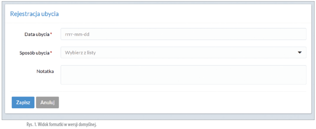 Nowa formatka jest też bardziej intuicyjna. Po wybraniu sposobu ubycia system automatycznie pokaże tylko te pola, które są w danym przypadku potrzebne do uzupełnienia. Na przykład: