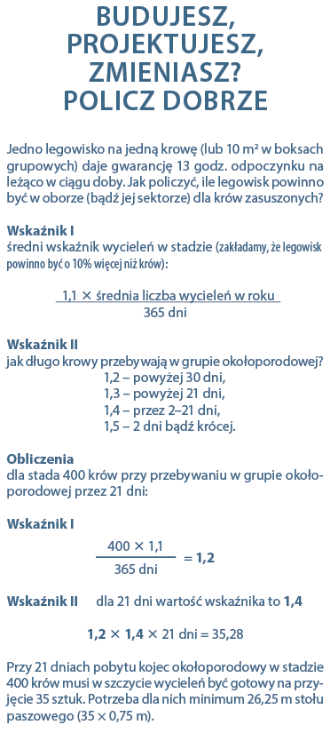 – A z tym w naszych oborach bywa różnie – przyznaje nasz rozmówca. Krowom zasuszonym nie trzeba wiele. Wystarczy odpowiednio duża przestrzeń z szerokim dostępem do stołu paszowego, miękka ściółka do leżenia i odpowiednia pasza. Ale… jak zwykle diabeł tkwi w szczegółach. Co w tym przypadku znaczy „odpowiedni”? Amerykanie, którzy bardzo lubią mieć wszystko przeliczone na dolary, opracowali zestaw podstawowych zaleceń, przydatnych by dobrze zaprojektować przestrzeń dla krów w okresie okołoporodowym.