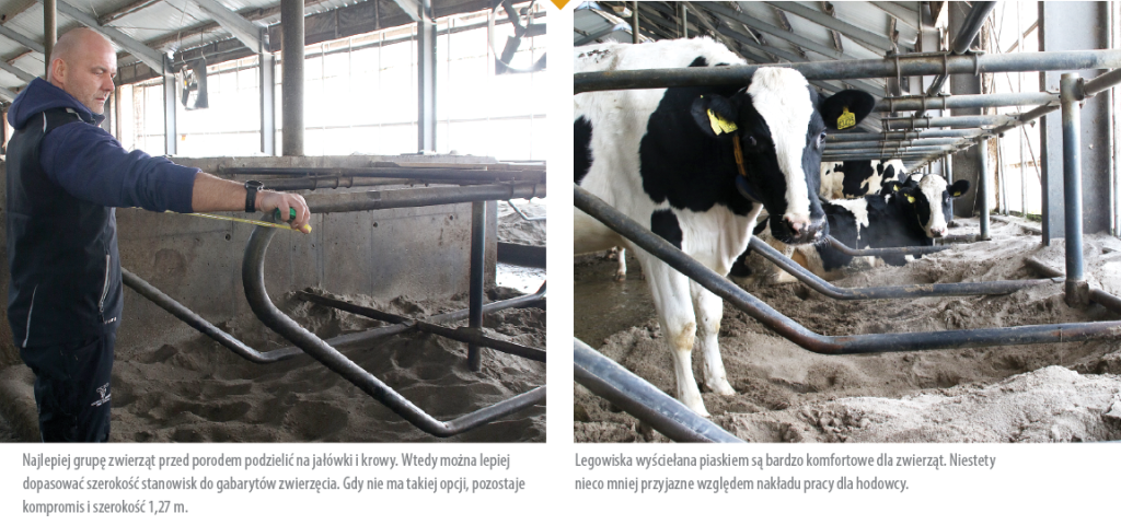 O ile sytuacja w przypadku boksu zbiorczego na głębokiej ściółce jest w miarę prosta – tu potrzeba tylko częstego ścielenia i przynajmniej 10 m2 na krowę, o tyle sytuacja komplikuje się, jeśli krowy zasuszane mają przebywać na legowiskach. Trzeba je bowiem dopasować i do okresu zasuszenia, i do gabarytów samicy (pierwiastka/wieloródka). Potrzebnych jest więc kilka opcji – krowy w zasuszeniu właściwym, czyli na początku okresu zasuszenia nie potrzebują aż tak dużo miejsca – wystarczy legowisko o szerokości 1,27 m. Przed wycieleniem gabaryty rosną, a wraz z nimi niezbędna szerokość legowiska – do 1,37 m. Ale… jałówkom przed wycieleniem wystarczy nawet 1,22 m. Problem pojawia się w momencie, kiedy mamy grupy mieszane – jałówki i krowy, które są ponadto na różnym etapie zasuszenia. Oczywiście można zrobić legowiska szerokie na 1,37 m. Zapewni to jałówkom komfort, ale dzięki temu, że na tak szerokich legowiskach będą mogły się położyć nawet w poprzek, ograniczymy bałagan i zabrudzenia. Alternatywą jest kompromis – i szerokość dla grup mieszanych 1,27 m.