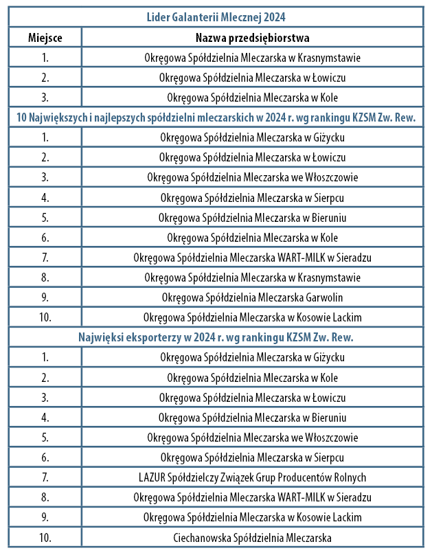 Jednym z punktów wydarzenia było przyznanie nagród dziesięciu największym spółdzielczym eksporterom oraz dziesięciu najlepszym spółdzielniom mleczarskim w Polsce według rankingu KZSM. Wyróżnienia wręczyli zastępca dyrektora generalnego KOWR Jan Szopiński, zastępca prezesa ARiMR Leszek Szymański oraz zarząd KZSM Zw. Rew. z Arkadiuszem Pisarkiem na czele.