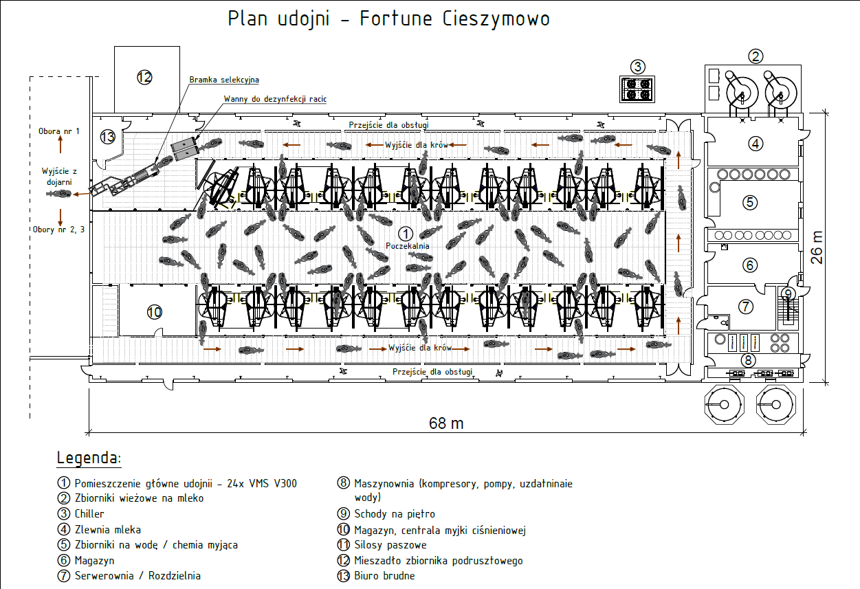 – Wtedy nasza firma zaprezentowała koncepcję doju grupowego i przykład instalacji z Dani z 24 robotami dla 1600 krów. I to ona okazała się strzałem w dziesiątkę. W Cieszymowie stanęła bardzo podobna – mówił przedstawiciel DeLaval. Budynek dla robotów ma wymiary 68 m × 26 m, na dłuższej ścianie umieszczono bramy typu garażowego, które pełnią funkcję wentylacji. Dodatkowo wymianę powietrza zapewnia 8 wentylatorów oraz otwór kalenicowy w dachu. Podłoga rusztowa w poczekalni oraz korytarze przepędowe o szerokości 2,5 m pokryte są gumowymi matami. Na korytarzu będzie pracował robot czyszczący, a w poczekalni umieszczono przegrodę, która pełni dwie funkcje – pozwala dowolnie odgrodzić krowy, a gumowa nakładka czyści ruszt.